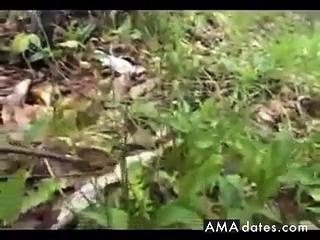Tight black haired teen Melanie B dildoing her twat outdoors