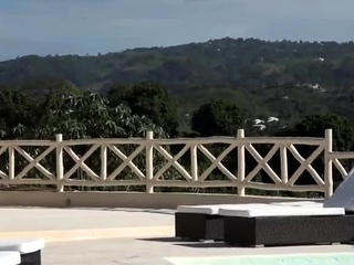 Girl showing tits outdoor by the pool